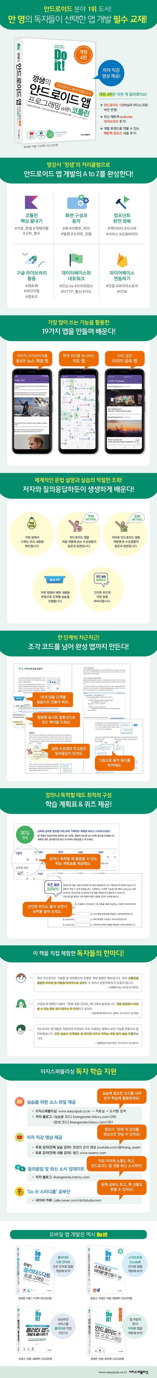¾Èµå·ÎÀÌµå ºÐ¾ß 1À§ µµ¼ÀÎ ¡¶Do it! ±ø»ùÀÇ ¾Èµå·ÎÀÌµå ¾Û ÇÁ·Î±×·¡¹Ö with ÄÚÆ²¸°¡·ÀÌ °³Á¤4ÆÇÀ¸·Î Ãâ°£µÆ´Ù. À̹ø¿¡´Â ¾Èµå·ÎÀ̵å 15(¹Ù´Ò¶ó¾ÆÀ̽ºÅ©¸²)¸¦ ±âÁØÀ¸·Î ´Þ¶óÁø ¾Èµå·ÎÀÌµå °³¹ß °úÁ¤À» ´ã¾Æ °³Á¤ÇßÀ¸¸ç, ½Ç½À ¼Ò½º Äڵ带 ¾÷µ¥ÀÌÆ®ÇßÀ» »Ó¸¸ ¾Æ´Ï¶ó Á¦Æ®ÆÑ ÄÄÆ÷Áî¿Í °°ÀÌ ¡®¿äÁò¡¯ °³¹ß Æ®·»µå¸¦ ¹Ý¿µÇÑ ³»¿ëÀ» Ãß°¡ÇØ Ã¥ÀÇ ¿Ï¼ºµµ¸¦ ÇÑÃþ ³ô¿´´Ù.
