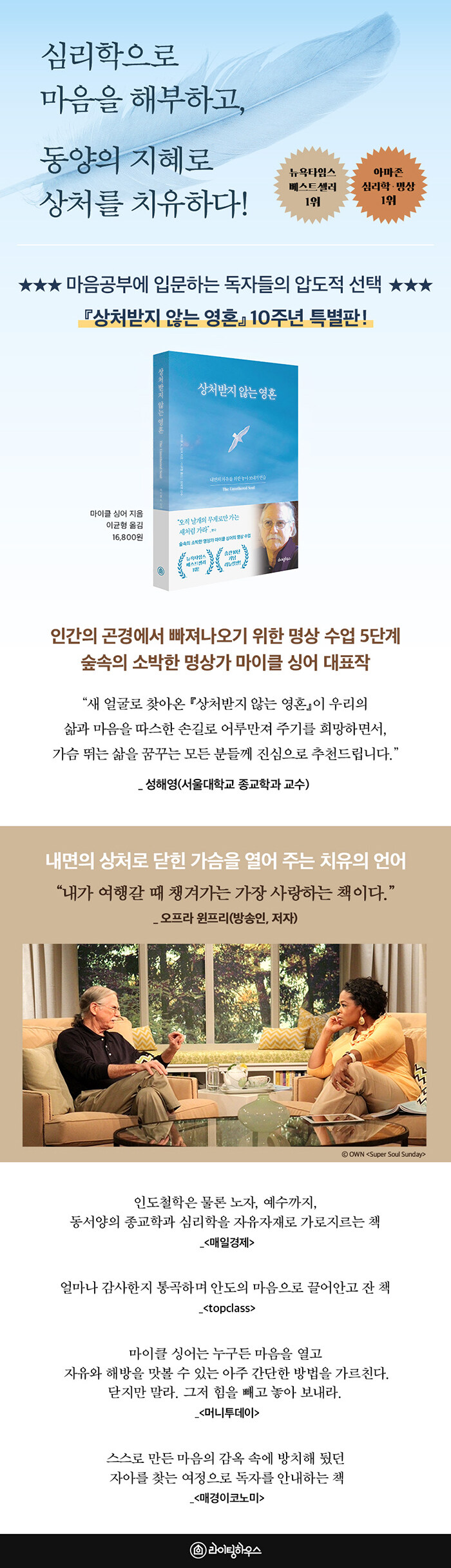 ´º¿åŸÀÓ½º º£½ºÆ®¼¿·¯ 1À§, ¾Æ¸¶Á¸ ½É¸®ÇÐ 1À§¿¡ ºû³ª´Â ¸¶ÀÌŬ ½Ì¾îÀÇ ¡®The Untethered Soul¡¯ÀÌ ¡º»óó¹ÞÁö ¾Ê´Â ¿µÈ¥(¶óÀÌÆÃÇϿ콺 ¹ßÇà)¡»À̶ó´Â Á¦¸ñÀ¸·Î ±¹³» Ãâ°£µÈ Áö 10ÁÖ³âÀ» ¸Â¾Æ »õ·Î¿î ¾ó±¼·Î µ¹¾Æ¿Ô´Ù. Çѱ¹°ú Àο¬ÀÌ ±íÀº ÀúÀÚÀÇ Çѱ¹¾îÆÇ ¼¹®°ú ¼ºÇØ¿µ ±³¼öÀÇ °¨¼ö¿Í ÇÔ²² ¿ÏÀüÆÇÀ¸·Î µ¹¾Æ¿Â ÀÌ ÀÛǰÀº ¿ÀÇÁ¶ó À©ÇÁ¸®°¡ ¡®¿©Çà °¥ ¶§ ¹Ýµå½Ã ì°Ü°¡¾ß ÇÒ Ã¥¡¯À¸·Î ¼Õ²ÅÀ¸¸ç À¯¸íÇØÁø Àü¼³ÀûÀÎ ½É¸® Ä¡À¯¼ÀÌ´Ù. ¿ªÀÚ´Â Ãß°¡µÇ°Å³ª ´©¶ôµÈ ¿ø°íÀÇ ¹ø¿ª°ú ÇÔ²² »õ·Î¿î °¨°¢À¸·Î ÀÛǰ Àüü¸¦ ´Ùµë¾î ¿ÏÀüÆÇÀÇ °¡Ä¡¸¦ ´õÇß´Ù. Áö±Ýµµ ¿©ÀüÈ÷ ¾Æ¸¶Á¸ ºÐ¾ß 1À§¸¦ ÁöŰ¸ç ½ÄÀ» ÁÙ ¸ð¸£´Â »ç¶ûÀ» ¹Þ°í ÀÖ´Â ÀÌ Ã¥ÀÇ ¼º°ø ºñ°áÀº ¿ÜºÎÀÇ Á¶°Ç¿¡¼ ÀÚ½ÅÀÇ ÇູÀ» ãÀ¸·Á Çß´ø »ç¶÷µéÀÇ ½Ã¼±À» °¢ÀÚÀÇ ³»¸éÀ¸·Î µ¹¸®°Ô ÇÑ µ¥ ÀÖ´Ù. ±×¸®°í ±× ÀÛÀº º¯È´Â °Å´ëÇÑ ÀÚ±â Çõ¸íÀÇ ½ÃÀÛÀÌ µÇ¾ú´Ù.