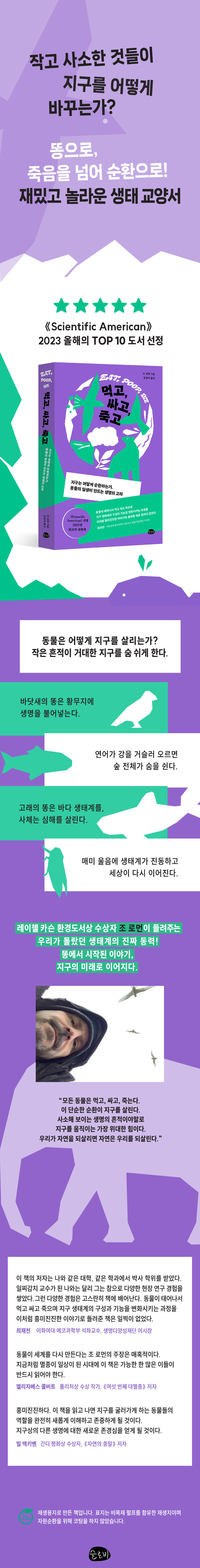 ¸ðµç µ¿¹°Àº ¸Ô°í ½Î°í Á״´Ù. ±×·±µ¥ ±×´ÙÀ½¿¡´Â ¾î¶² ÀÏÀÌ ¹ú¾îÁú±î? »ýÅÂÇÐÀÚ Á¶ ·Î¸ÕÀº ¿ì¸®°¡ ¹«½ÉÄÚ Áö³ªÄ¡´Â ÀÚ¿¬ÀÇ ¼ûÀº ¼øÈ¯ °í¸®¸¦ Áý¿äÇÏ°Ô ÃßÀûÇÑ´Ù. µ¿¹°ÀÌ ¹è¼³ÇÏ°í »ç¶óÁø ÀÚ¸®¿¡ ¶Ç ´Ù¸¥ »ý¸íÀÌ ¿òÆ®°í, ³²°ÜÁø ¹è¼³¹°°ú »çü´Â À̵¿°ú ºÐÇØ¸¦ °ÅÃÄ ¿¡³ÊÁö¿Í ¿µ¾çºÐÀ¸·Î ¹Ù²ï´Ù. ±×·¸°Ô »ýŰ踦 Ÿ°í È帣¸ç ¼û°ÜÁø ¼øÈ¯ÀÇ °í¸®¸¦ ÀÌ·é´Ù. ÀúÀÚ´Â ÀÌ º¸ÀÌÁö ¾Ê´Â È帧À̾߸»·Î Áö±¸¸¦ »ì¾Æ ÀÖ°Ô ÇÏ´Â ±Ùº»ÀûÀÎ µ¿·ÂÀ̶ó°í µÇ¤´Â´Ù.