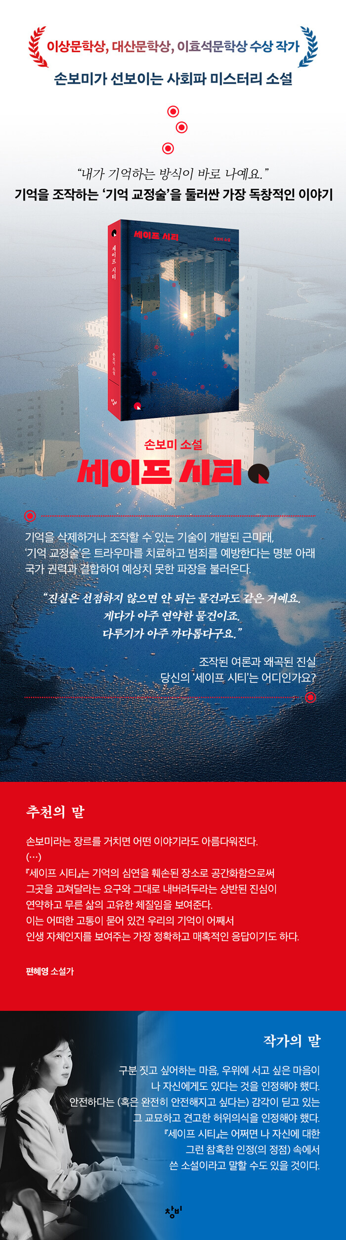 ¡º¼¼ÀÌÇÁ ½ÃƼ¡»´Â À帣¼Ò¼³°ú º»°Ý¹®ÇÐÀÇ °æ°è¸¦ ³Ñ³ªµé¸ç µ¶ÀÚ¿¡°Ô ÁöÀûÀÎ ½º¸±°ú À±¸®Àû ±äÀåÀ» µ¿½Ã¿¡ Á¦°øÇÑ´Ù. ¹Ì½ºÅ͸®¿Í SFÀû »ó»ó·ÂÀ» ¹ÙÅÁÀ¸·Î ÇÏÁö¸¸ ±× ¾È¿¡ ´ã±ä Áú¹®µéÀº öÀúÈ÷ Çö½ÇÀ» ÇâÇϰí ÀÖ´Ù. ºÒ¿ÏÀüÇÏ°í »óó¹ÞÀº ±â¾ïÁ¶Â÷µµ ¿ì¸® Á¸ÀçÀÇ ÀϺÎÀÓÀ» ¹Þ¾ÆµéÀÌ´Â ½ÇÁ¸Àû °¢¼º, ±â¼ú ¹ßÀüÀÌ Á¦±âÇÏ´Â À±¸®Àû µô·¹¸¶¿Í Á¨´õÈµÈ Æø·ÂÀÇ ¹®Á¦±îÁö, ÀÌ ÀÛǰÀÌ ´Ù·ç´Â ÁÖÁ¦´Â º¹ÇÕÀûÀÌ°í ´ÙÃþÀûÀÌ´Ù. ¿©¼º ÈÀå½Ç¸¸À» ÆÄ±«ÇÏ´Â ¿¬¼â ¹üÁË, ¡®À¯»ê ÈÄ ÈÞÁ÷ÇÑ ¿©¼º °æÂû¡¯À̶ó´Â ÇÁ·¹ÀÓÀÌ ¸¸µé¾î³»´Â ½Å·Ú¼ºÀÇ À§±â, ±¸µµ½É¿¡¼ ´õ¿í Ãë¾àÇØÁö´Â ¿©¼º ³ë¼÷ÀÚµéÀÇ Á¸Àç. ÀÛ°¡´Â ±â¾ï°ú ±Ç·ÂÀÇ ¹®Á¦°¡ Á¨´õ¿Í ±³Â÷ÇÏ´Â ÁöÁ¡µéÀ» ¼¶¼¼ÇÏ°Ô Æ÷ÂøÇϸç, ´Ü¼øÇÑ »çȸ °í¹ßÀ» ³Ñ¾î Àΰ£ Á¸ÀçÀÇ ±Ùº»Àû Á¶°ÇÀ» ޱ¸ÇÑ´Ù. ÀÌ·¯ÇÑ ¹¬Á÷ÇÑ ÁÖÁ¦¸¦ ¼¶¼¼ÇÏ°Ô ´Ù·ç¸é¼µµ ¼»çÀÇ ÃßÁø·ÂÀ» ÀÒÁö ¾Ê´Â ¡º¼¼ÀÌÇÁ ½ÃƼ¡»´Â ¼Õº¸¹Ì ¹®ÇÐÀÌ µµ´ÞÇÑ »õ·Î¿î °æÁöÀÌÀÚ »çȸÆÄ ¼Ò¼³ÀÇ »õ·Î¿î °¡´É¼ºÀ» º¸¿©ÁØ´Ù.