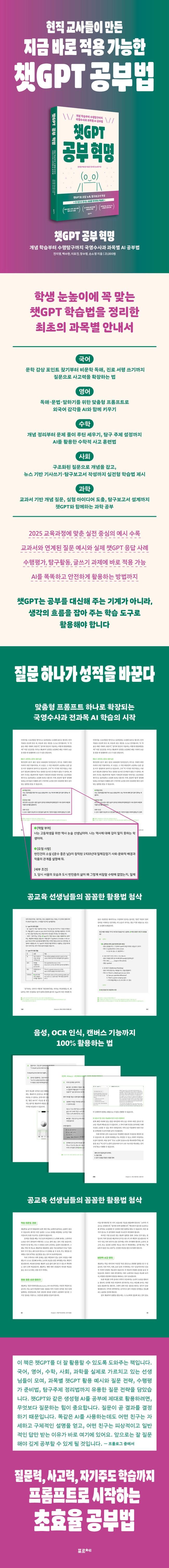 ÀÌ¹Ì ¸¹Àº ÇлýÀÌ ÃªGPT¸¦ Ȱ¿ëÇϰí ÀÖÁö¸¸ Á¦´ë·Î µÈ ¾È³»¼°¡ ¾ø¾î ±× °¡´É¼º°ú Ȱ¿ëÀÌ ¹«±Ã¹«ÁøÇÑ ÃªGPT´Â Á¤º¸ °Ë»ö Á¤µµ·Î ÀÌ¿ëÇÏ´Â µ¥ ±×Ä¡°í ÀÖ´Ù. ÀÌ¿¡ ÇöÁ÷ Áß°íµîÇб³ ±³»çµéÀÌ ±³À°°úÁ¤°ú ½ÇÁ¦ ¼ö¾÷ °æÇèÀ» ¹ÙÅÁÀ¸·Î êGPT¸¦ ¾î¶»°Ô °³ÀÎ ÇнÀÀÚÀÇ °øºÎ¿¡ Ȱ¿ëÇÒ ¼ö ÀÖ´ÂÁö °ú¸ñº°·Î »ó¼¼ÇÏ°Ô ¾Ë·Á ÁÖ¸ç, °³³ä ÇнÀ°ú ¼öÇàÆò°¡, ޱ¸º¸°í¼ ÀÛ¼º±îÁö Ȱ¿ëÇÒ ¼ö ÀÖµµ·Ï ¾È³»ÇÑ´Ù. ƯÈ÷ ÇлýÀÌ Á÷Á¢ Áú¹®ÇÏ°í ´äÀ» ÀÀ¿ëÇÒ ¼ö ÀÖµµ·Ï °ú¸ñº° ÇÁ·ÒÇÁÆ®¸¦ Á¦°øÇÏ¿© êGPT¸¦ Ȱ¿ëÇÑ ÀÏ´ëÀÏ ¸ÂÃãÇü °øºÎ°¡ °¡´ÉÇϵµ·Ï ¼Ò°³ÇÑ´Ù. ±¹¾î, ¿µ¾î, ¼öÇÐ ÁÖ¿ä °ú¸ñ»Ó¸¸ ¾Æ´Ï¶ó »çȸ, °úÇРŽ±¸ °ú¸ñ±îÁö Àü °ú¸ñÀÇ °³³ä ÀÌÇØ¡¤¹®Á¦ Ç®ÀÌ¡¤Å½±¸ÇÏ´Â ¹æ¹ýÀ» ¾È³»Çϰí, °ú¸ñº° ¼öÇàÆò°¡¡¤Å½±¸º¸°í¼¡¤±Û¾²±â °úÁ¦¿¡µµ Áï½Ã Ȱ¿ë °¡´ÉÇÑ Æ÷¸ËÀ» Á¦¾ÈÇÑ´Ù.