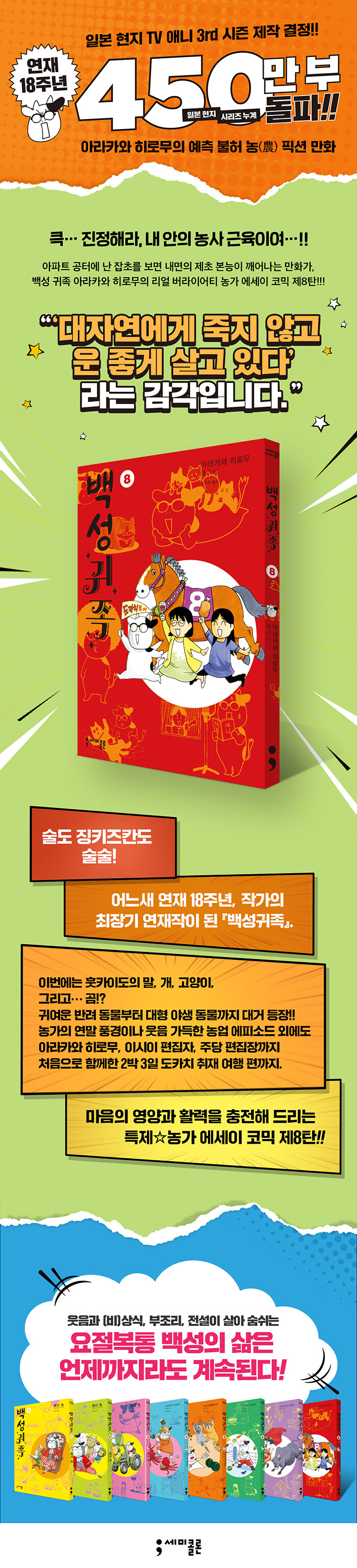 ¡º°Ã¶ÀÇ ¿¬±Ý¼ú»ç¡»·Î ¼¼°èÀûÀÎ »ç¶ûÀ» ¹ÞÀº ¸¸È°¡ ¾Æ¶óÄ«¿Í È÷·Î¹«°¡ ¶Ç ´Ù¸¥ ´ëÇ¥ÀÛ ¡º¹é¼º±ÍÁ·¡» 8±ÇÀ¸·Î µ¹¾Æ¿Ô´Ù. À̹ø 8±ÇÀº ¸», °õ, °¡Á·, µðÀÚÀÎ, ±âÈÄ, µ¿¹°, ¿ª»ç µî ´Ù¾çÇÑ ÁÖÁ¦¸¦ ³Ñ³ªµé¸ç ³ó°¡ÀÇ »î°ú ÀÚ¿¬ÀÇ ¼øÈ¯ ¼Ó¿¡¼ ¹ß°ßÇÑ ¿ôÀ½°ú °¨µ¿À» ÀüÇÑ´Ù. ¾Æ¶óÄ«¿Í È÷·Î¹« ƯÀ¯ÀÇ ³¯Ä«·Î¿î °üÂû·Â°ú À¯¸Ó·¯½ºÇÑ ½Ã¼±ÀÌ ºû³ª´Â ÀÌ ½Ã¸®Áî´Â, ´Ü¼øÇÑ ¸¸È¸¦ ³Ñ¾î Çö´ë ³ó¾÷°ú Àΰ£, ÀÚ¿¬ÀÇ À̾߱⸦ À¯ÄèÇÏ°Ô Ç®¾î³»¸ç ±íÀº ¿ï¸²À» ¼±»çÇϰí ÀÖ´Ù.