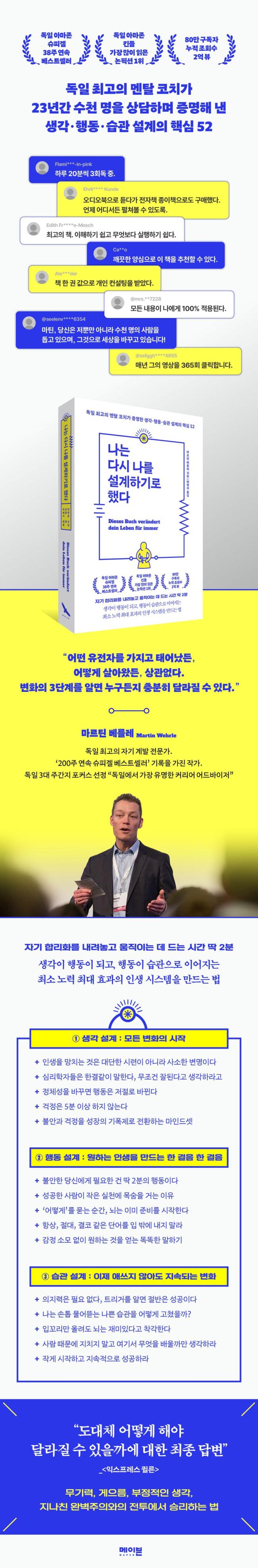 ¡®»ý°¢-Çൿ-½À°ü¡¯Àº ±ä¹ÐÇÏ°Ô ¿¬°áµÅ ÀÖ´Ù. »ý°¢À» Á¶±Ý¸¸ ¹Ù²Ù¸é ÇൿÀÌ ½¬¿öÁö°í, ÀÛÀº ÇൿÀÌ ½×ÀÌ¸é ¾î´À»õ ½À°üÀÌ ´Þ¶óÁø´Ù. ¸¶¸£Æ¾ º£¸¦·¹´Â ³ú°úÇÐ, ½É¸®ÇÐ, öÇÐ ÀÌ·ÐÀ» ºñ·ÔÇØ ¼öõ °ÇÀÇ »ó´ã »ç·Ê¸¦ Åä´ë·Î, ´õ Å« º¯È¸¦ À̲ô´Â ÇÙ½ÉÀûÀÎ º¯ÈÀÇ Æ®¸®°ÅµéÀ» ÀÌ Ã¥¿¡ ´ã¾Ò´Ù. ±×ÀÇ Á¶¾ðÀ» ½ÇõÇÏ´Ù º¸¸é, ÃÖ¼Ò ³ë·ÂÀ¸·Î ÃÖ´ë È¿°ú¸¦ ´Þ¼ºÇÏ´Â °íÈ¿À²ÀÇ Àλý ½Ã½ºÅÛÀ» ¿Ï¼ºÇÒ ¼ö ÀÖÀ» °ÍÀÌ´Ù.