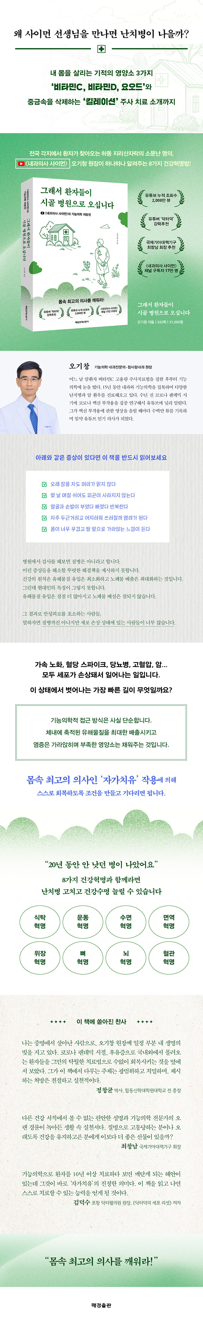 ÀúÀÚÀÎ ¿À±ââ ¿øÀåÀº ¾î´À ³¯ ¾ÏȯÀÚ ºñŸ¹ÎC °í¿ë·® ÁÖ»çÄ¡·á¹ýÀ» Á¢ÇÏ°í ±â´ÉÀÇÇп¡ ´«À» ¶á µÚ, 15³â µ¿¾È ´Ù¾çÇÑ ³Ä¡º´°ú ¾ÏÀ» ´Ù·ç°í ÀÖ´Â ±â´ÉÀÇÇÐ Àü¹®°¡´Ù. Äڷγª ÆÒµ¥¹Í ½Ã±â¿¡ ¹é½Å ºÎÀÛ¿ëÀ» ÁýÁß ¿¬±¸ÇØ À¯Æ©ºê¸¦ ÅëÇØ ³Î¸® ¾Ë¸®¸é¼ ÀϾà Àαâ ÀÇ»ç ¹Ý¿¿¡ ¿Ã¶ú´Ù. ´Ü¼øÇϸ鼵µ º¹ÀâÇÑ ÀÌ °Ç°ÀÇ ¿ø¸®¸¦ ±ú´Ý°í °Ç°ÇØÁö±â¸¦ ¹Ù¶ó´Â ¸¶À½¿¡¼, ±×¸¦ °ÅÄ£ ¼ö¸¹Àº ȯÀÚµéÀÇ ¿¡ÇǼҵ带 °çµé¿© '8°¡Áö °Ç°Çõ¸í'À» ½±°í Àç¹ÌÀÖ°Ô ³ì¿©³Â´Ù.