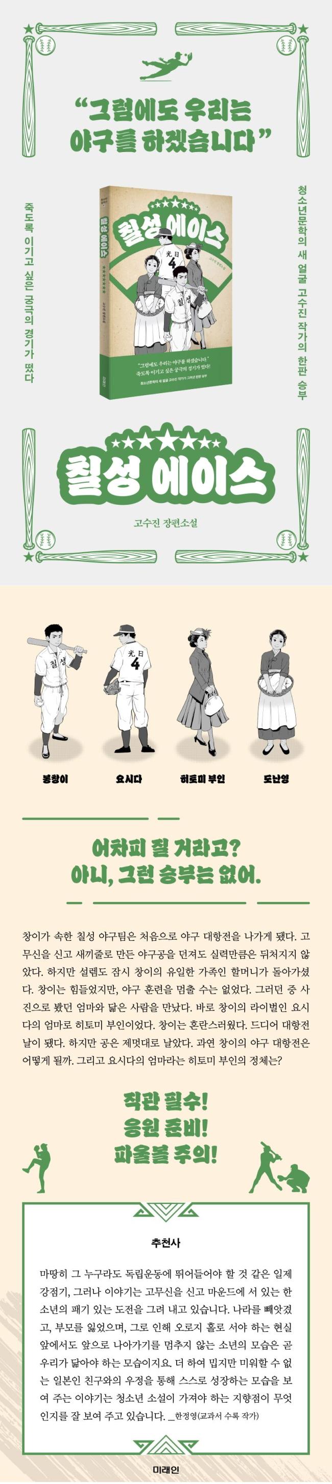 ´©±º°¡¿¡°Ô´Â ´ç¿¬ÇÏ°Ô ÁÖ¾îÁö´Â °ÍÀÌ ´©±º°¡´Â ¾Ö½á¾ßÁö¸¸ ÀÌ·ïÁö±âµµ ÇÑ´Ù. ¼Ò¼³ ¡ºÄ¥¼º ¿¡À̽º¡»´Â ÀÏÁ¦ °Á¡±â ½Ã´ë¿¡ ÁÖÀΰø âÀÌÀÇ Ä¡¿ÇÑ ¾ß±¸ ½ÂºÎ¿Í ³²¸ð¸¦ ºñ¹ÐÀ» ǰ°í ÀÖ´Â ¿ª»ç ¼Ò¼³ÀÌ´Ù. °í±ººÐÅõÇϸç ÇϷ縦 ¹öƼ´ø ½ÃÀý, ±× ¾È¿¡¼µµ ²ÞÀ» ÀÒÁö ¾Ê´Â Á¤½Å°ú Ä£±¸ÀÌÀÚ ¶óÀ̹úÀ̶ó´Â °ü°èÀÇ ¹è¿òÀ» Ç®¾ú´Ù.