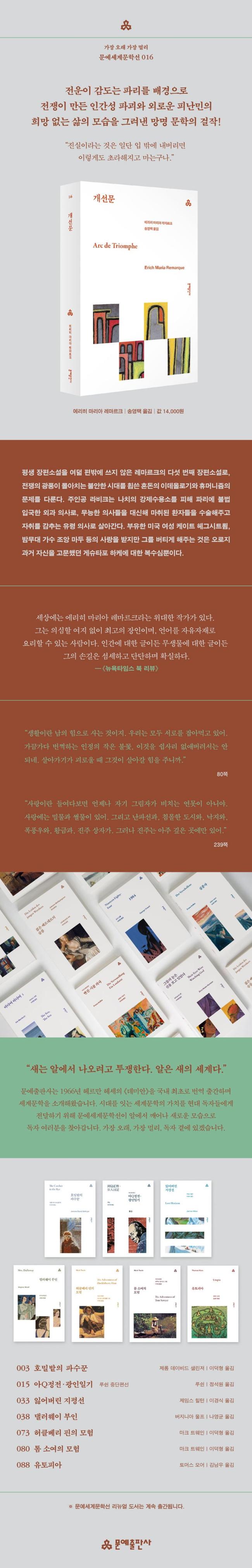 ¡¶°³¼±¹®¡·Àº ¡¶¼ºÎÀü¼± ÀÌ»ó ¾ø´Ù¡· ÀÌÈÄ ¹ßÇ¥ÇÑ ·¹¸¶¸£Å©ÀÇ ´Ù¼¸ ¹øÂ° ÀåÆí¼Ò¼³·Î, ±× ÀÌÀü¿¡ ¹ßÇ¥ÇÑ ÀåÆí¼Ò¼³ ³× ÆíÀÇ ¼ÓÆíÀ̶ó°í ÇÒ ¼ö ÀÖ´Ù. ³ªÄ¡½º µ¶ÀÏ¿¡ ÂÑ°Ü À¯·´ °¢±¹¿¡¼ ÆÄ¸®·Î µµ¸ÁÃÄ ¿Â Çdz¹ÎµéÀÌ ¸ð¿© ÀÖ´Â ¸ù¸¶¸£Æ®¸£ÀÇ °ª½Ñ ¼÷¼Ò¸¦ ¹è°æÀ¸·Î, Çdz¹Î Áß ÇÑ »ç¶÷ÀÎ ¿Ü°ú ÀÇ»ç ¶óºñÅ©ÀÇ Àý¸ÁÀû ÀÏ»ó»ýȰ°ú ÇൿÀ» ´ã¹éÇÏ°Ô ¹¦»çÇÑ´Ù. ¶ÇÇÑ 2Â÷ ¼¼°è´ëÀü Àü¾ßÀÇ ºÒ¾È°ú °øÆ÷¿¡ Âù Áö½ÄÀÎÀÇ Á¤½Å »óŸ¦ ´«¿¡ º¸ÀÏ µíÀÌ ±×·Á³»¾î ÃÖ°íÀÇ ¹ÝÀü ¼Ò¼³ÀÌÀÚ ¸Á¸í ¹®ÇÐÀÇ °ÉÀÛÀ¸·Î Æò°¡¹Þ°í ÀÖ´Ù. ¡¶°³¼±¹®¡·¸¸Å ·¹¸¶¸£Å©ÀÇ »ç»óÀ», ¿©ÀÎÀÇ ¹æÈ²ÇÏ´Â °ü´ÉÀ», ³²³àÀÇ ¾ß¸©ÇÑ ½É¸® °¥µîÀ» ±³¹¦ÇÏ°Ô ¹¦»çÇÑ ÀÛǰµµ ¾ø´Ù. ÀÛ°¡ÀÇ Ç³ºÎÇÑ ½ÃÁ¤°ú ¾ÖÀýÇÑ ¼Á¤ÀÌ ¿©ÇÑ ¾øÀÌ ¹¦»çµÇ¾ú°í, ƯÈ÷ Á¶¾Ó ¸¶µÎ¿Í ÁÖÀΰø ¶óºñÅ©ÀÇ °¡½¿ ¾ÆÇÁ°í ¾ÖÀýÇÑ, ¾îµò°¡ µÚƲ¸° »ç¶ûÀº Àд ÀÌÀÇ ¸¶À½À» Àú¸®°Ô ÇÑ´Ù.