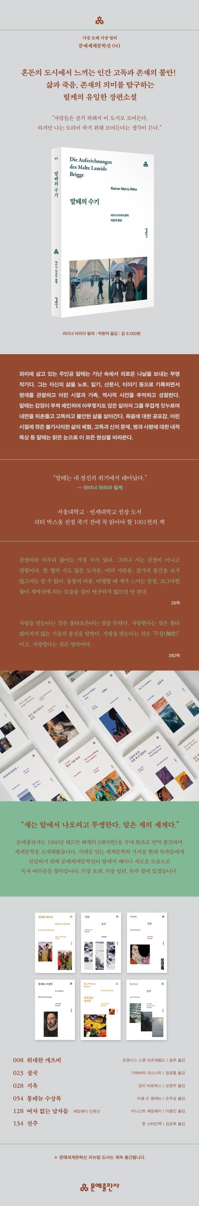 ¡¶¸»Å×ÀÇ ¼ö±â¡·´Â 1904³â 2¿ù 8ÀϺÎÅÍ 1910³â 1¿ù 27ÀÏ »çÀÌ¿¡ ¾´ ¸±ÄÉÀÇ À¯ÀÏÇÑ ÀåÆí¼Ò¼³·Î 1, 2ºÎ·Î ±¸¼ºµÇ¾î ÀÖ´Ù. ÀÌ ÀÛǰÀº Á¤¸®µÈ ÁٰŸ®³ª »ç°ÇÀÌ ¾øÁö¸¸ ´ÜÆíÀÇ ÁýÇÕ°úµµ °°Àº ÀÌ ¼Ò¼³ÀÇ Çü½ÄÀº ³»ÀûÀ¸·Î´Â ÅëÀÏÀ» ÀÌ·é´Ù. Àü¹ÝºÎ¿¡ ÇØ´çÇÏ´Â 1ºÎ¿¡¼´Â ¡®Á×À½¡¯ÀÇ ¹®Á¦, ÈĹÝÀÎ 2ºÎ¿¡¼´Â ¡®»ç¶û¡¯ÀÇ ¹®Á¦¸¦ »À´ë·Î »ï°í ÀÖ´Ù. 1ºÎ´Â µ§¸¶Å© Ãâ½ÅÀÇ ¹«¸íÀÛ°¡ÀÎ ÁÖÀΰøÀÌ ´À³¢´Â ÆÄ¸®ÀÇ Àλó°ú ºÒ¾È, Á¶±¹ µ§¸¶Å©¿¡¼ Á׾ ¿©·¯ »ç¶÷µé¿¡ ´ëÇÑ È¸»ó, À¯³â ½ÃÀý ±×¸¦ °øÆ÷·Î ¸ô¾Æ³Ö¾ú´ø ¿ÜÇҾƹöÁö Áý¾È¿¡ ´ëÇÑ À̾߱â, ¼Õ¿¡ ´ëÇÑ È¯°¢, ¾î¸Ó´Ï¿¡ ´ëÇÑ ±â¾ï µîÀ» ´ã°í ÀÖ´Ù. 2ºÎ¿¡¼µµ À¯³â ½ÃÀýÀ» ȸ»óÇϴµ¥ µ¶¼, ¿øÇü ±ØÀå, ¡®»ç¶û¿¡ »ç´Â ¿©Àε顯¿¡ ´ëÇÑ Âù°¡, ¹ÌÁöÀÇ ¿©ÀÎÀÌ º£³×Ä¡¾Æ¿¡¼ ºÎ¸¥ °¡°î, ¼º¼ÀÇ ÅÁ¾Æ À̾߱⿡ ´ëÇÑ ´ë´ãÇÑ ÇØ¼® µîÀ» ´ã°í ÀÖ´Ù.