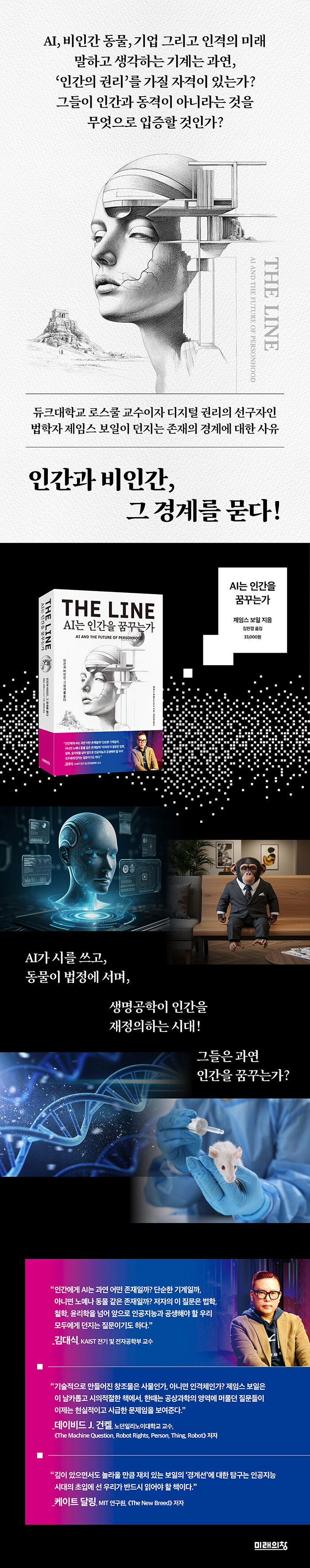 ¡¶AI´Â Àΰ£À» ²Þ²Ù´Â°¡¡·Àº ¡®Àΰ£¡¯°ú ¡®Àΰ£ÀÌ ¾Æ´Ñ Á¸À硯 »çÀÌ¿¡ ³õÀÎ °æ°è¼±À» Áý¿äÇÏ°Ô ÆÄ°íµç´Ù. ¹«¾ùÀÌ Àΰ£À» Àΰ£ÀÌ°Ô Çϴ°¡? ±×¸®°í Àΰ£¸¸ÀÌ ¹ýÀû ±Ç¸®¸¦ °¡Áú ÀÚ°ÝÀÌ Àִ°¡? ÀÌÁ¦±îÁö ¿ì¸®´Â ¡®Á¾¡¯À» ±âÁØÀ¸·Î ±Ç¸®¸¦ ºÎ¿©ÇؿԴÙ. ±×·¯³ª AI°¡ ¾ð¾î¸¦ ¸¸µé°í, »ý°¢ÇÏ´Â °Íó·³ º¸À̰í, ½º½º·Î Á¸À縦 ÁÖÀåÇϱ⠽ÃÀÛÇÏ¸é¼ ±× ±âÁØÀÌ Èçµé¸®°í ÀÖ´Ù. ÀúÀÚ Á¦ÀÓ½º º¸ÀÏÀº ¹ýÇÐÀÚÀÌÀÚ °ø°ø Áö½ÄÀç»êÀÇ ¼±±¸ÀÚ·Î, À̹ø¿¡´Â ¡®Àΰݡ¯À̶ó´Â ´Ù¼Ò Ãß»óÀûÀÌÁö¸¸ ½ÇÁ¸ÀûÀÎ ÁÖÁ¦¸¦ °¡Áö°í µ¶ÀÚÀÇ È£±â½ÉÀ» ÀÚ±ØÇÑ´Ù. ¹ý°ú öÇÐ, °úÇаú SF, À±¸®¿Í ´ëÁß¹®È°¡ ¾î¿ì·¯Áö´Â Èï¹ÌÁøÁøÇÑ ¿©Á¤À» ÅëÇØ °ú¿¬ AI¿Í ÇÔ²²ÇÏ´Â ¿ì¸®ÀÇ ¹Ì·¡°¡ ¾î¶»°Ô Àü°³µÉ °ÍÀÎÁö »ìÆìº»´Ù.