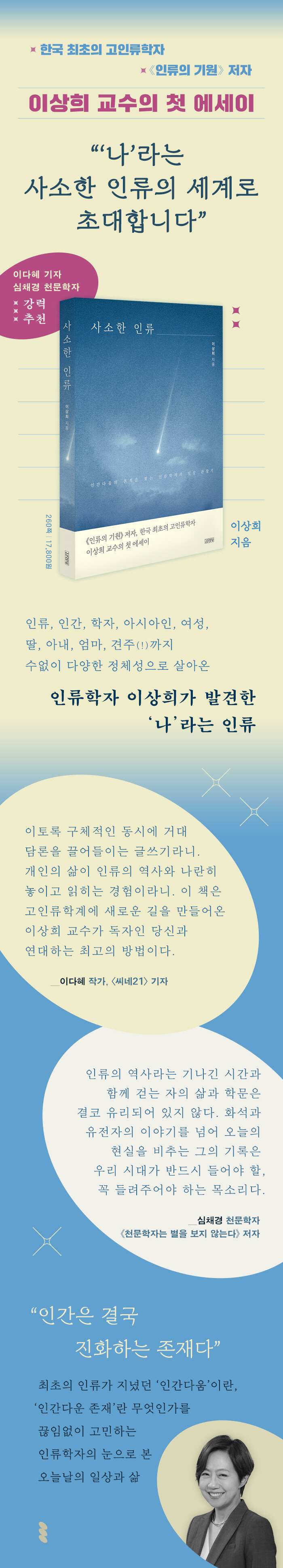 °íÀηùÇÐÀÚ´Â ¼ö¹é¸¸ ³â Àü ÀηùÀÇ È¼®ÈµÈ »ÄÁ¶°¢°ú À¯¹°À» ÅëÇØ °íÀηù°¡ ³²±ä ÈçÀûÀ» ã°í ¿ì¸® Á¶»óÀÇ »îÀ» ÃßÀûÇÏ´Â ÀÏÀ» ÇÑ´Ù. ±â³ª±ä ¿µÀå·ùÀÇ ÁøÈ»ç¿¡¼ ¾îµðºÎÅ͸¦ Àηù·Î º¼ °ÍÀΰ¡? ´ëÇѹα¹ 1È£ °íÀηùÇÐÀÚ ÀÌ»óÈñ ±³¼öÀÇ Ã¹ ¿¡¼¼ÀÌ ¡¶»ç¼ÒÇÑ Àηù¡·¿¡ ÃÖÃÊÀÇ Àηù°¡ Áö³æ´ø ¡®Àΰ£´Ù¿ò¡¯À̶õ, ¡®Àΰ£´Ù¿î Á¸À硯¶õ ¹«¾ùÀΰ¡¸¦ ²÷ÀÓ¾øÀÌ °í¹ÎÇÏ´Â Á÷¾÷ÀÎÀÇ ´«À¸·Î º» ¿À´Ã³¯ÀÇ ÀÏ»ó°ú »îÀÌ ´ã°å´Ù. ÀÌ»óÈñ ±³¼ö´Â Çѱ¹ Çа迡 °íÀηùÇÐÀ̶ó´Â ºÐ¾ß°¡ ä ¼Ò°³µÇ±âµµ ÀüºÎÅÍ ¹Ì±¹¿¡¼ °íÀηùÇÐÀ» ¿¬±¸ÇÑ Çѱ¹ ÃÖÃÊÀÇ °íÀηùÇÐÀÚ´Ù. ÀúÀÚ´Â ¸ÅÀÏ µÎ ¹ß·Î ¶¥À» µó°í °ÉÀ¸¸é¼, Ã¥À» ÀÐÀ¸¸é¼, ¸ñ¿åÅÁ ¼Ó ¿©ÀÚµéÀÇ ´Ùä·Î¿î ¸Ç¸öÀ» º¸¸é¼, À°¾Æ¿Í Ãâ»êÀ» °ÅÄ¡¸é¼, °³¸¦ Ű¿ì¸é¼ ´À³¢°í »ý°¢Çß´ø ÀÏ»óÀÇ ´Ü»óÀ» À¯ÄèÇϸ鼵µ ³¯Ä«·Ó°Ô Ç®¾î³õ´Â´Ù.