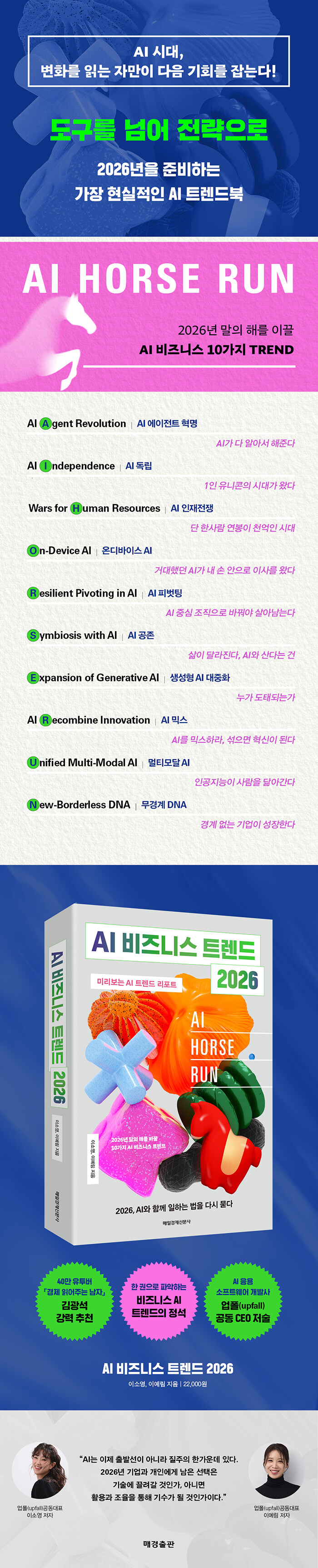 ÀÌ Ã¥Àº AI Àü¹® ½ºÅ¸Æ®¾÷ ¾÷Æú(upfall)ÀÌ ¼±º°ÇÑ 2026³âÀ» ÁÖµµÇÒ 10°¡Áö Æ®·»µå¸¦ Á¦½ÃÇÑ´Ù. Àü¹®°¡ÀÇ µµ¿ò ¾øÀÌ ½º½º·Î µµ±¸¸¦ ¼±ÅÃÇϰí Ȱ¿ëÇÒ ¼ö ÀÖ´Â ½Ã´ë°¡ µµ·¡Çß´Ù´Â ¡®AI µ¶¸³¡¯°ú, ¿ì¸® »ýȰ°ú ¹®È Àü¹Ý¿¡ ½º¸çµç »ý¼ºÇü AIÀÇ ¡®´ëÁßÈ¡¯, Á¢±ÙÇÒ ¼ö ÀÖ´Â ´Ù¾çÇÑ AIÅø°ú ±× ±â´ÉÀ» Á¶ÇÕÇÏ¿© »õ·Î¿î ¾÷¹« °¡Ä¡¸¦ ¸¸µå´Â Àü·« ¡®AI ¹Í½º¡¯, ÅØ½ºÆ®¿Í À̹ÌÁö»Ó¸¸ ¾Æ´Ï¶ó, À½¼º°ú ¿µ»ó, 3D±îÁö ÅëÇÕ ºÐ¼®ÇÏ´Â ¡®¸ÖƼ¸ð´Þ¡¯ µî ³»³â AI ½Ã´ë¸¦ ÁÖµµÇÒ 10°¡Áö ÀλçÀÌÆ®¸¦ Àü´ÞÇÑ´Ù. ¶ÇÇÑ ÀÌ Æ®·»µå¸¦ ¹ÙÅÁÀ¸·Î ±â¾÷¿¡¼ ½ÇÁ¦·Î AI¸¦ ¾î¶»°Ô µµÀÔÇϰí ÀÖ´ÂÁö, ¶Ç ¾î¶² »ê¾÷¿¡¼ °¡Àå ºü¸£°Ô º¯È°¡ ÀϾ´ÂÁö µîÀ» ±¸Ã¼ÀûÀÎ »ç·Ê¸¦ ÅëÇØ º¸¿©ÁØ´Ù. ¸¶Áö¸· ÆÄÆ®¿¡¼´Â ´ë±â¾÷ ÀÓ¿ø°ú Àü¹®°¡ÀÇ ÀÎÅͺ並 ÅëÇØ ±Û·Î¹ú ¸®´õµéÀÌ »ý°¢ÇÏ´Â AI »ê¾÷ÀÇ ¹Ì·¡ ÁöÇ⼺°ú ÀλçÀÌÆ®µµ ´ã¾Æ³Â´Ù. ÀüÀÛ ¡¶AI ºñÁî´Ï½º Æ®·»µå 2025¡·°¡ AI ÁÖ¿ä µµ±¸ Áöµµ¸¦ ±×·ÁÁá´Ù¸é, À̹ø 2026³âÆÇÀº ¡®¾î¶² ±â¼úÀ» ¾²´À³Ä¡¯º¸´Ù ¡®¾î¶»°Ô Ȱ¿ëÇϰí Á¶À²ÇÏ´À³Ä¡¯°¡ ÇÙ½É °æÀï·ÂÀÓÀ» °Á¶ÇÑ´Ù.