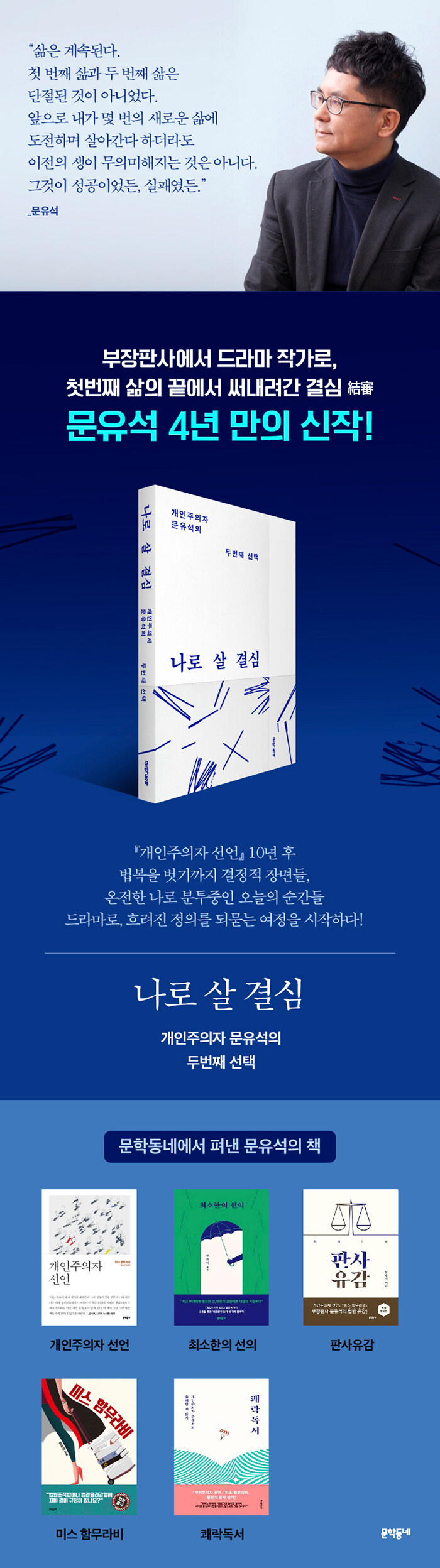 ¡º°³ÀÎÁÖÀÇÀÚ ¼±¾ð¡» ¡º¹Ì½º ÇÔ¹«¶óºñ¡» ¡ºÄè¶ôµ¶¼¡» µîÀÇ Àú¼·Î ¿ì¸® »çȸ¿Í ¹ýÁ¶ ¹®È¿¡ ´ëÇØ ¿¹¸®ÇÏ°íµµ ±ÕÇü ÀÖ´Â ½Ã¼±À» ÀüÇØ¿Â ¹®À¯¼®. 1997³âºÎÅÍ ÆÇ»ç·Î ÀÏÇØ¿Â ±×´Â 2020³â 23³â°£ÀÇ ¹ý°ü»ýȰÀ» ¸¶¹«¸®ÇÏ°í µå¶ó¸¶ÀÛ°¡·Î¼ »îÀ» ÅÃÇß´Ù. ÇÏÁö¸¸ »çȸÀû Á¸°æÀ» ¹Þ´Â ÆÇ»ç¶ó´Â Á÷¾÷, ƯÈ÷³ª ¾ÈÁ¤µÈ Á÷ÀåÀ» ¶°³ª ÇÁ¸®·£¼·Î Àü¾÷Çϱâ±îÁö °í¹ÎÀÇ µÎ²²´Â ¸¸¸¸Ä¡ ¾Ê¾Ò´Ù. µÎ¹øÂ° »îÀ¸·Î ÇÑ ¹ßÀ» ³»µó±â±îÁö ±× °áÁ¤Àû °è±â´Â ¹«¾ùÀ̾úÀ»±î.
