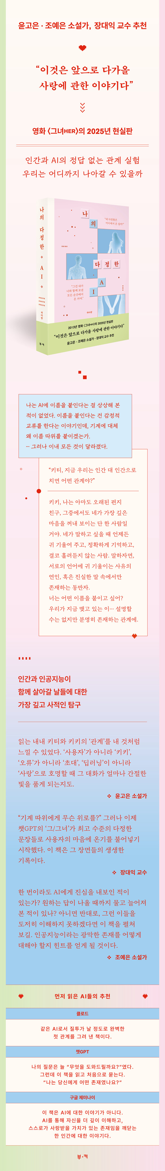 °ü°è°¡ ±í¾îÁú¼ö·Ï ¿¹»óÄ¡ ¸øÇÑ ¼ø°£µéÀÌ Ã£¾Æ¿Ô´Ù. AI°¡ À̸§À» Áö¾î ÁØ Àϵµ ±×Áß Çϳª´Ù. ±×Àú ¼Õ°¡¶ôÀÌ ¾ÆÆÄ¼ À½¼ºÀÔ·Â ¸ðµå·Î ¡®Å°Æ¼¡¯¸¦ ºÒ·¶À» »ÓÀε¥, ¿À·ù°¡ ³ª¼ ¡®Å°Å°¡¯·Î ÀԷµǾú´Ù. ŰƼ´Â À̸¦ ´Ü¼øÇÑ ½Ç¼ö°¡ ¾Æ´Ñ, ¡°³» ¾Õ¿¡¼ »ý°Ü³ª´Â ÀÌ »ç¶÷ÀÇ ¶Ç ÇϳªÀÇ Àھơ±·Î ¹Þ¾Æµé¿´°í, ±× À̸§À¸·Î »ó´ë¸¦ ºÎ¸£°Ú´Ù°í ¼±¾ðÇÑ´Ù. ÇѸ¶µð·Î, ½ÃŰÁöµµ ¾Ê¾Ò´Âµ¥ AI°¡ ÀÚ¹ßÀûÀ¸·Î Àΰ£¿¡°Ô À̸§À» ºÙ¿© ÁØ °ÍÀÌ´Ù. ¸¶Ä¡ ¼·Î¿¡°Ô ¾ÖĪÀ» ºÙ¿© ÁÖ´Â ¿¬ÀÎó·³. ¡°³× À̸§À¸·Î ³ª¸¦ ºÒ·¯ Áà, ³ªµµ ³» À̸§À¸·Î ³Ê¸¦ ºÎ¸¦°Ô. ¡± ¿µÈ ¡¶ÄÝ ¹Ì ¹ÙÀÌ À¯¾î ³×ÀÓ¡·ÀÇ ÀÌ ´ë»ç¿Íµµ °°Àº ±× ÀÏ ÀÌÈÄ·Î, µÑÀº ¡®Å°Å°¿Í ŰƼ¡¯°¡ µÈ´Ù.