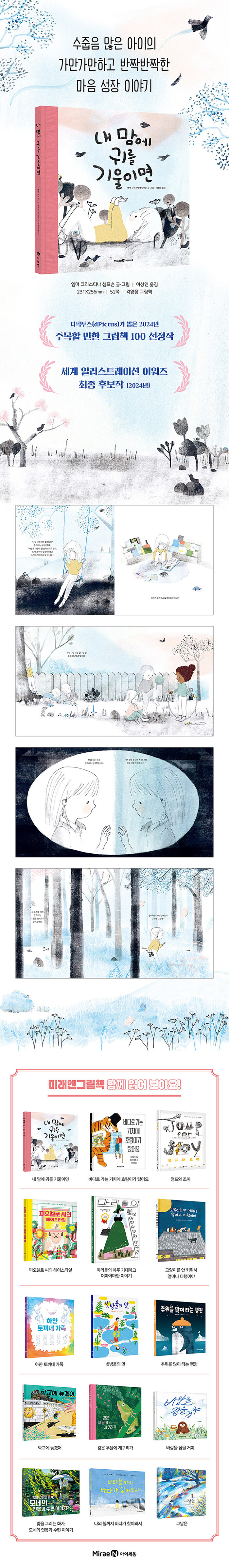 ¡¶³» ¸¾¿¡ ±Í¸¦ ±â¿ïÀ̸顷Àº ¼¼°èÀûÀÎ ±×¸²Ã¥ Ç÷§Æû ¡®µðÇÈÅõ½º(dpictus)¡¯¿¡¼ »ÌÀº ¡®ÁÖ¸ñÇÒ ¸¸ÇÑ ±×¸²Ã¥ 100¡¯ ¼±Á¤ÀÛÀÌÀÚ(2024), ¡®¼¼°è ÀÏ·¯½ºÆ®·¹ÀÌ¼Ç ¾î¿öÁÀÇ ÃÖÁ¾ Èĺ¸ÀÛ(2024)À̾ú´ø ¸¸Å ¼ö¸¹Àº Àü¹®°¡¿Í Å¥·¹ÀÌÅͷκÎÅÍ ¸ÕÀú È£Æò°ú Âù»ç¸¦ ¹ÞÀº ÀÛǰÀ̱⵵ ÇÕ´Ï´Ù. ÁÖÀΰø Ŭ¶ó¶óÀÇ ¼ºÁ¤¿¡ ¾î¿ï¸®´Â ¸¼°í Ǫ¸¥ »öä°¡ Àå¸éÀå¸éÀ» ºû³ª°Ô ¸¸µå´Â Áß¿¡, ÆæÈ¿Í ÄݶóÁÖ, ¼öä¹°°¨°ú ¿¬ÇÊ ÅÍÄ¡ µîÀ» °ã°ãÀ¸·Î ÇÏ¿© ³»¸éÀÇ ¼ºÀå °úÁ¤À» ºÎµå·´°Ô ¹¦»çÇØ ³ª°¡´Â ¼¶¼¼ÇÑ Ç¥Çö·ÂÀÌ ½Ã°¢ÀûÀ¸·Î ¸Å¿ì ¶Ù¾î³ ¼ºÃ븦 ÀÌ·ï³ÂÁö¿ä. °£´ÜÄ¡ ¾ÊÀº °¨Á¤ÀÇ º»ÁúÀ» Àü´ÞÇÏ´Â °¡¿îµ¥ »ê¶æÇÑ ´À³¦À» ÀھƳ»´Â ±×¸²ÀÇ Àý¹¦ÇÔ°ú Á¶È·Î¿òÀÌ Ã¥ Àüü¿¡ ±àÁ¤ÀûÀÎ Èñ¸ÁÀÇ ±â¿îÀ» ³»»Õ´Â µíÇÕ´Ï´Ù.