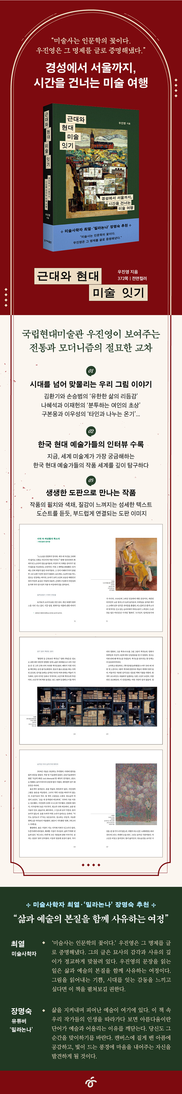 È«ÀÍ´ëÇб³ ´ëÇпø¿¡¼ Çѱ¹ ±ÙÇö´ë¹Ì¼ú»ç¸¦ Àü°øÇÏ°í ±¹¸³Çö´ë¹Ì¼ú°ü¿¡¼ Çп¹¿¬±¸¿øÀ¸·Î ÀÏÇϰí ÀÖ´Â ¿ìÁø¿µÀÇ ºû³ª´Â ù Ã¥ ¡¶±Ù´ë¿Í Çö´ë ¹Ì¼ú Àձ⡷°¡ Ãâ°£µÆ´Ù. ÀÌ Ã¥Àº ¹Ì¼ú»çÀÇ È帧 ¼Ó¿¡¼, ±Ù´ëÀÇ ¼û°á°ú Çö´ëÀÇ ¸öÁþÀÌ ¸Â¹°¸®´Â ±³Â÷Á¡À» ¼¶¼¼ÇÏ°Ô Æ÷ÂøÇÑ´Ù. ÀÏÁ¦°Á¡±â, ±¤º¹°ú Çѱ¹ÀüÀï µî ½Ã´ëÀû ¾î·Á¿òÀ» Åë°úÇÑ ¿¹¼ú°¡µéÀÇ °í¹ÎÀº 21¼¼±â ¼¿ïÀ̶ó´Â ¼û°¡»Û µµ½Ã¸¦ »ì¾Æ°¡´Â ¿¹¼ú°¡µéÀÇ °í¹Î°ú ¿¬°áµÈ´Ù. ¿©¼ºÀ» ÇâÇÑ »çȸÀû Æí°ß¿¡ ¿¹¼ú·Î½á ¸Â¼± ±Ù´ë ÀÛ°¡ ³ªÇý¼®°ú Çö´ë ÀÛ°¡ ÀÌÀçÇå, À¯ÇÑÇÑ »î ¼Ó¿¡¼µµ º¯ÇÏÁö ¾Ê´Â °¡Ä¡¸¦ ÁÀÀº ±èȯ±â¿Í ¼Õ½Â¹ü, ŸÀΰú ¿Â±â¸¦ ³ª´©°í ½ÍÀº ¸¶À½À» ±×¸²¿¡ ´ãÀº ±¸º»¿õ°ú À̿켺 µîÀÌ ½Ã´ë¸¦ °Ç³Ê ¸¸³´Ù. »îÀÇ º»Áú°ú °¡Ä¡¸¦ Ç¥ÇöÇϰíÀÚ ÇÏ´Â ¿¹¼ú°¡µéÀÇ ¿¸ÁÀº 100¿© ³âÀÇ ½Ã°£À» °Ç³Ê ¿À¹ö·¦µÈ´Ù. ÀúÀÚ´Â 5°³ ºÎ¿¡ °ÉÃÄ ÃÑ 47ÀÎÀÇ ±ÙÇö´ëÀÇ ¿¹¼ú°¡¸¦ ¿¬°áÇϸç, °æ¼º¿¡¼ ¼¿ï±îÁö ½Ã°£À» °¡·ÎÁö¸£´Â µ¶Æ¯ÇÑ ¹Ì¼ú ¿©ÇàÀ¸·Î µ¶ÀÚ¸¦ À̲ö´Ù.