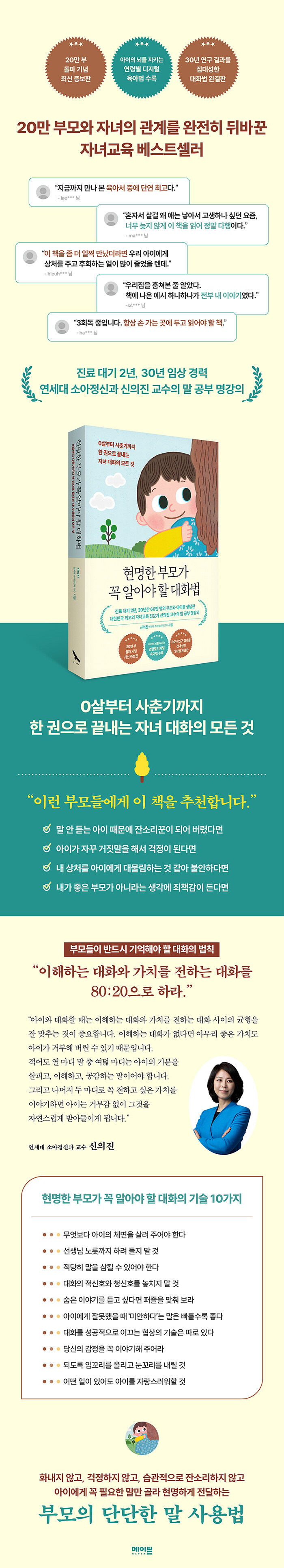 ÀÌ Ã¥Àº ºÎ¸ð°¡ ¾ÆÀÌ¿¡ ´ëÇØ °¡Áö´Â Æí°ß°ú ÀÚÁÖ ÀúÁö¸£´Â ´ëÈÀÇ ½Ç¼ö¸¦ ¤¾î ³»°í, Çö¸íÇÑ ºÎ¸ð°¡ ¾Ë¾Æ¾ß ÇÒ ½ÇÀü ´ëÈÀÇ ±â¼úÀ» 10°¡Áö·Î Á¤¸®Çß´Ù. ¡®¹«¾ùº¸´Ù ¾ÆÀÌÀÇ Ã¼¸éÀ» »ì·Á ÁÖ¾î¾ß ÇÑ´Ù¡¯, ¡®¼±»ý´Ô ³ë¸©±îÁö ÇÏ·Á µéÁö ¸» °Í¡¯, ¡®´ëÈÀÇ Àû½ÅÈ£¿Í û½ÅÈ£¸¦ ³õÄ¡Áö ¸» °Í¡¯, ¡®´ëȸ¦ ¼º°øÀûÀ¸·Î À̲ô´Â Çù»óÀÇ ±â¼úÀº µû·Î ÀÖ´Ù¡¯, ¡®µÇµµ·Ï ÀÔ²¿¸®¸¦ ¿Ã¸®°í ´«²¿¸®¸¦ ³»¸± °Í¡¯ µî ´çÀå Àû¿ëÇÒ ¼ö ÀÖ´Â Çö½Ç ¹ÐÂøÇü ´ëȹýÀº ¾ÆÀÌ¿ÍÀÇ °ü°è¸¦ µ·µ¶È÷ ´ÙÁö¸é¼ ¾ÆÀ̸¦ ½º½º·Î º¯È½ÃŰ´Â µ¥ µµ¿òÀ» ÁÙ °ÍÀÌ´Ù.