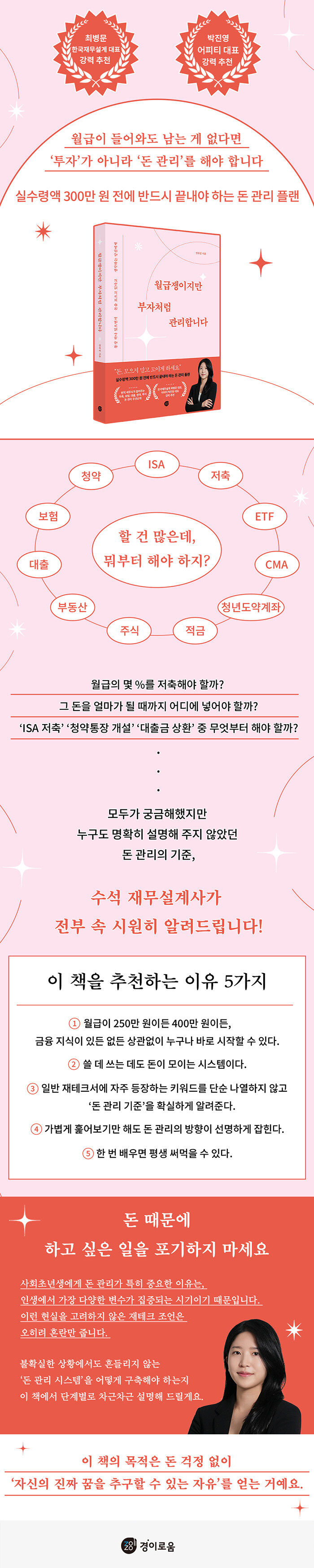½Å°£ ¡º¿ù±ÞÀïÀÌÁö¸¸ ºÎÀÚó·³ °ü¸®ÇÕ´Ï´Ù¡»´Â ¿ù±ÞÀ̶ó´Â ÀÛÀº ¾¾¾ÑÀ» ¾î¶»°Ô Áö۰í Ű¿ïÁö °í¹ÎÇÏ´Â »çȸÃʳâ»ýµéÀ» À§ÇÑ '°¡Àå ±âÃÊÀûÀ̰í Çö½ÇÀûÀÎ' µ· °ü¸® ¸Å´º¾óÀÌ´Ù. ÀÌ Ã¥Àº ÀúÃà, §Å×Å©, ÁÖ½Ä, ºÎµ¿»êó·³ ÀÏ¹Ý ÀçÅ×Å©¼¿¡¼ ÈçÈ÷ º¼ ¼ö Àִ Ű¿öµå¸¦ ³ª¿ÇÏÁö ¾Ê´Â´Ù. ´ë½Å ¡®µ· °ü¸®ÀÇ ±âÁØ¡¯À» »î¿¡ ½±°Ô Àû¿ëÇϵµ·Ï ÇÏ´Â µ¥ ÁýÁßÇÑ´Ù. ¿¹¸¦ µé¾î ¡®Ç¬µ· ¾Æ³¢´Â ¹æ¹ý¡¯ ¡®ÅõÀÚÀÇ Á߿伺' °°Àº ¿ø·ÐÀû À̾߱Ⱑ ¾Æ´Ï¶ó, ¡®¿ù±Þ¿¡¼ ÀúÃàÇÒ ¼ö ÀÖ´Â µ·Àº ¾ó¸¶Àΰ¡?¡¯ ¡®±× µ·À» ¾ó¸¶°¡ µÉ ¶§±îÁö ¾îµð¿¡ ³ÖÀ» °ÍÀΰ¡?¡¯ ¡®ISA ÀúÃà, û¾àÅëÀå °³¼³, ´ëÃâ±Ý »óȯ Áß ¹«¾ùºÎÅÍ ÇØ¾ß Çϳª?¡¯ µî ±×µ¿¾È ¸ðµÎ°¡ ±Ã±ÝÇØÇßÁö¸¸ ´©±¸µµ ¸íÈ®È÷ ¼³¸íÇØ ÁÖÁö ¾Ê¾Ò´ø ³»¿ëÀ» ÇϳªÇϳª ¤¾îÁÖ´Â ½ÄÀÌ´Ù.