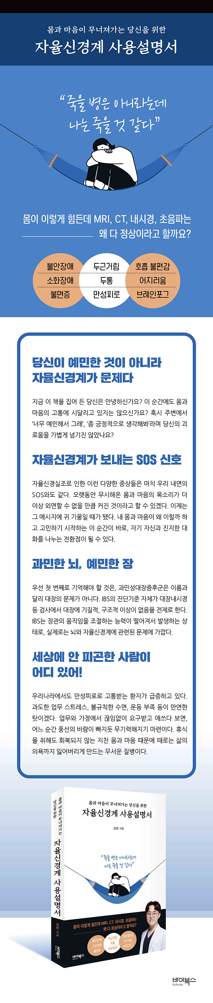 Áúº´º¸´Ùµµ »ç¶÷ÀÇ ¸ö°ú ¸¶À½À» ´õ °ü½É ÀÖ°Ô ¹Ù¶óº¸°íÀÚ ³ë·ÂÇÏ´Â ÇÑÀÇ»ç ±èÂùÀÌ ¡°Á×À» º´Àº ¾Æ´Ï¶ó´Âµ¥ ³ª´Â Á×À» °Í °°´Ù¡±´Â ºÐµéÀ» À§ÇØ ¡¶¸ö°ú ¸¶À½ÀÌ ¹«³ÊÁ®°¡´Â ´ç½ÅÀ» À§ÇÑ ÀÚÀ²½Å°æ°è »ç¿ë¼³¸í¼¡·¸¦ ¼¼»ó¿¡ ³»³õ´Â´Ù. ÀÚÀ²½Å°æ°è ÀÌ»ó°ú ÇÔ²² µ¿¹ÝµÇ´Â ¸ö°ú ¸¶À½ÀÇ ´Ù¾çÇÑ Áõ»óµéÀ» Ä¡·áÇÑ °æÇèÀ» ´ã¾Ò´Ù. º´¿ø ¼îÇÎÀ» ¸ØÃß°í ½ÍÀº ´ç½ÅÀÌ Àоî¾ß ÇÒ ¸¶Áö¸· °Ç°¼´Ù.