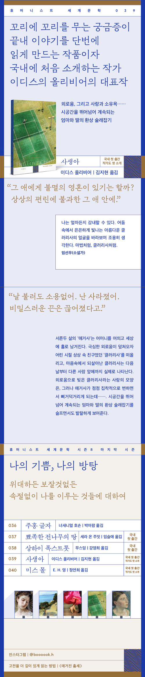¾ð¶æ °íµñ¼Ò¼³ÀÇ ¹®¹ý°ú ºÐÀ§±â·Î Èê·¯°¡´Â ¡¶»ç»ý¾Æ¡·´Â ¾Ö°Å»ç°¡ ½º½º·Î âÁ¶ÇÑ Á¸Àç¿¡ ´ëÇØ ¸ðµç ¼ÒÀ¯±ÇÀ» °¡Á®¾ß ÇÑ´Ù´Â µí ÇൿÇÑ´Ù´Â Á¡¿¡¼ ¡¶ÇÁ¶ûÄ˽´Å¸ÀΡ·À» ¶°¿Ã¸®°Ôµµ ÇÑ´Ù. ¡¶»ç»ý¾Æ¡·´Â ¿©¼º°ú ¼Ò¼öÀÚÀÇ ¸ñ¼Ò¸®¿¡ ÁÖ¸ñÇÏ´Â ¡®ºñ¶ó°í ¸ð´ø Ŭ·¡½Ä¡¯¿¡ Æ÷ÇԵǾú°í 2021³â ´ë¿µµµ¼°ü¿¡¼ 20¼¼±â ÃÊ¹Ý ¿©¼º ÀÛ°¡ÀÇ ¼Ò¼³À» »õ·Ó°Ô ¹ß±¼ÇßÀ» ¶§ Æ÷ÇÔµÇ¸ç ´Ù½Ã±Ý È¸ÀڵǾú´Ù.