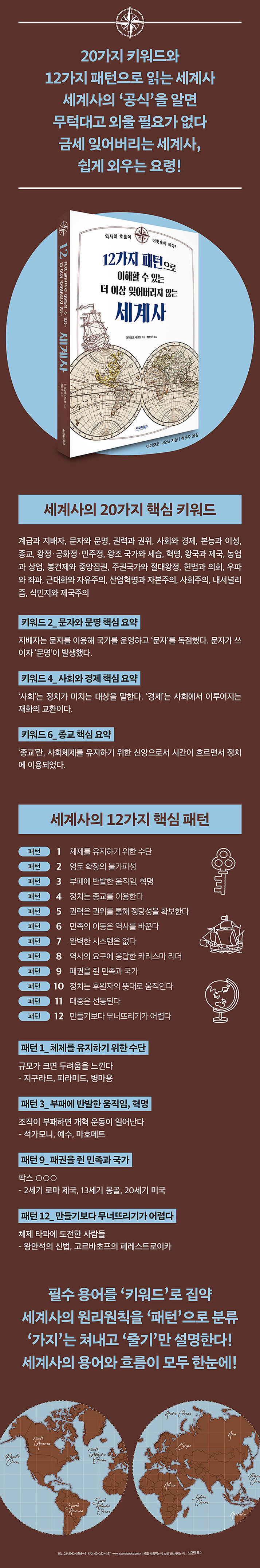 ÀÌ Ã¥Àº 20°¡Áö Ű¿öµå¿Í 12°¡Áö ÆÐÅÏÀ¸·Î ¼¼°è»ç¸¦ Àϸñ¿ä¿¬ÇÏ°Ô Á¤¸®Çϰí ÀÖ´Ù. ÀúÀÚ´Â ¹æ´ëÇÑ Áö½ÄÀ» ÀÚ¿¬½º·´°Ô ÀÚ½ÅÀÇ °ÍÀ¸·Î ¸¸µé±â À§ÇØ Á¤º¸¸¦ ¾î¶»°Ô Á¤¸®ÇÏ°í ±â¾ïÇÒÁö, ü°èÈÇÒ ¹æ¹ýÀ» »ý°¢Çß°í, ±× °á°ú 1¡®¿ª»ç ¿ë¾îÀÇ Á¤ÀÇ ÀÌÇØÇϱ⡯, 2¡®¿ª»çÀÇ ÆÐÅÏ ÀÌÇØÇϱ⡯¾ß¸»·Î ¼¼°è»ç °øºÎÀÇ ÇÙ½ÉÀÓÀ» Å͵æÇß´Ù. ÀÌ Ã¥ 1Àå¿¡¼´Â ¼¼°è»çÀÇ 20°¡Áö ÇÙ½É Å°¿öµå¸¦ ¾Ë¾Æº¸°í, 2Àå¿¡¼´Â ¼¼°è»ç ¼Ó¿¡¼ ¹Ýº¹Çؼ ³ªÅ¸³ª´Â 12°¡Áö ÆÐÅÏÀ» ¤¾î°£´Ù. ÀÌ Ã¥À» ÅëÇØ ¼¼°è»ç¸¦ Á» ´õ ½±°Ô ÆÄ¾ÇÇÒ ¼ö ÀÖÀ» °ÍÀÌ´Ù.