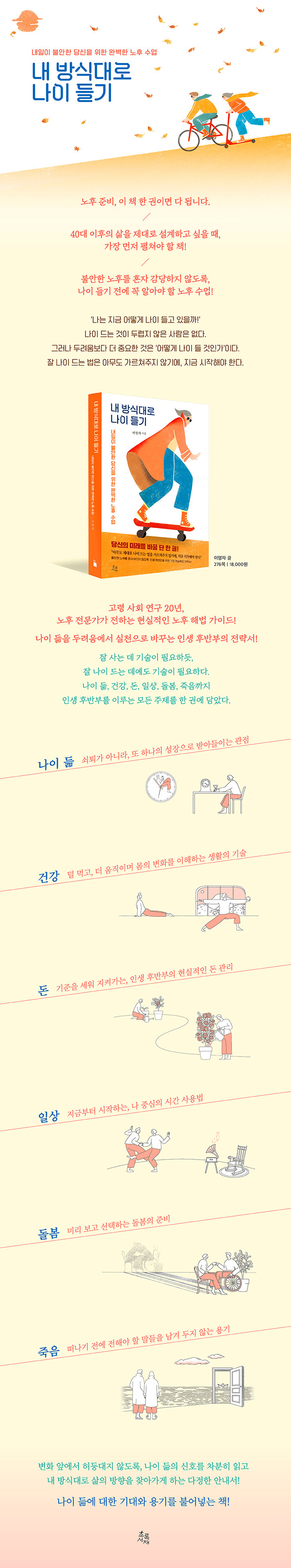 ³ªÀÌ µêÀº ´©±¸¿¡°Ô³ª °øÆòÇÏ°Ô Ã£¾Æ¿ÀÁö¸¸, ±× º¯È¸¦ ¾î¶»°Ô ¹Þ¾ÆµéÀ̰í ÁغñÇÏ´À³Ä¿¡ µû¶ó Àλý ÈĹÝÀÇ Ç³°æÀº ÀüÇô ´Ù¸£°Ô ÆîÃÄÁø´Ù. Àß »ç´Â µ¥ ±â¼úÀÌ ÇÊ¿äÇϵí, Àß ³ªÀÌ µå´Â µ¥¿¡µµ ¹è¿ò°ú ¿¬½ÀÀÌ ÇÊ¿äÇÏ´Ù. ¡¶³» ¹æ½Ä´ë·Î ³ªÀÌ µé±â¡·´Â ³ëÈĸ¦ ºÒ¾ÈÀÇ ½Ã±â°¡ ¾Æ´Ï¶ó, ÀÚ½ÅÀÇ ¼Óµµ·Î Â÷ºÐÇϸ鼵µ ´Ü´ÜÇÏ°Ô ¸ÂÀÌÇϵµ·Ï µ½´Â Çö½ÇÀûÀÎ Àü·«¼´Ù. ³ªÀÌ µê, °Ç°, µ·, ÀÏ»ó, µ¹º½, Á×À½±îÁö »îÀÇ ÈĹݺο¡ ¸¶ÁÖÇÏ°Ô µÇ´Â ÁÖÁ¦µéÀ» ±íÀÌ ÀÖ°Ô ´Ù·ç¸é¼, ´Ü¼øÇÑ Á¤º¸ Àü´ÞÀ» ³Ñ¾î º¯È ¼Ó¿¡¼ »ý±æ ¼ö ÀÖ´Â ¹®Á¦µéÀ» ½º½º·Î °èȹÇϰí ÁÖµµÀûÀ¸·Î Ç®¾î°¥ ¼ö ÀÖ´Â ½ÇÁúÀûÀÎ ¹æ¹ýÀ» Á¦½ÃÇÑ´Ù. ³ªÀÌ µêÀÌ µÎ·Á¿î À̵鿡°Ô´Â À§·Î¸¦, »õ·Î¿î »îÀ» ÁغñÇÏ´Â À̵鿡°Ô´Â ±æÀâÀ̸¦, ÀÌ¹Ì ³ë³âÀ» Áö³ª°í ÀÖ´Â À̵鿡°Ô´Â ÁöÇý¸¦ °Ç³×´Â Ã¥ÀÌ´Ù.