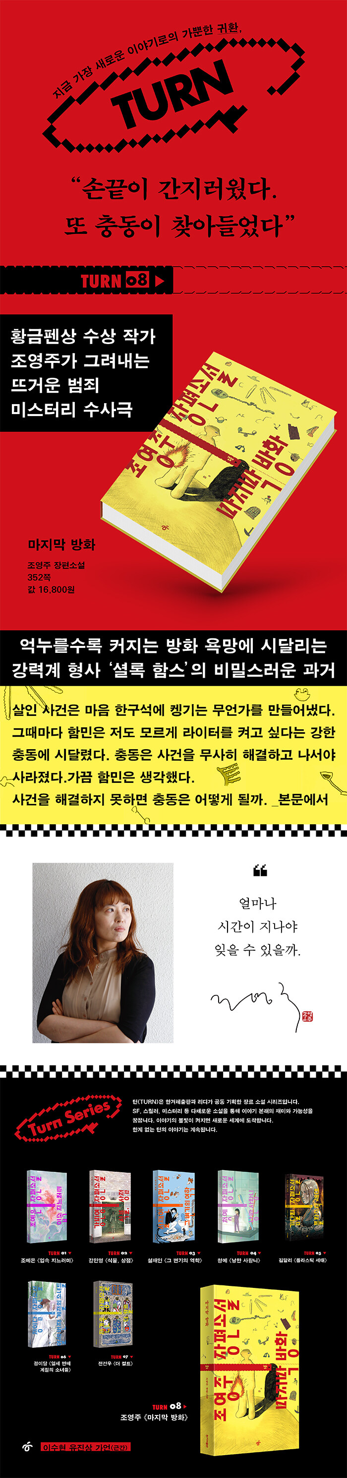 ¼¼°è¹®Çлó, KBS±è½Â¿Á¹®Çлó ½ÅÀλó Ãßõ¿ì¼ö»ó, ´ëÇѹα¹ µðÁöÅÐÀÛ°¡»ó ¿ì¼ö»ó, Ȳ±ÝÆæ»ó ¿ì¼ö»ó µîÀ» ¼ö»óÇÏ¸ç ±¹³» Ã߸®¹®Çа迡¼ ´Ü´ÜÈ÷ ÀÔÁö¸¦ ´ÙÁ®¿Â Á¶¿µÁÖ ÀÛ°¡ÀÇ ÀåÆí¼Ò¼³ ¡¶¸¶Áö¸· ¹æÈ¡·°¡ ÇѰܷ¹ÃâÆÇ ÅÏ ½Ã¸®Áî ¿©´ü ¹øÂ° ÀÛǰÀ¸·Î Ãâ°£µÇ¾ú´Ù. ¡¶È¨Áî°¡ º¸³½ ÆíÁö¡· ¡¶ºÓÀº ¼ÒÆÄ¡· ¡¶¹ÝÀüÀÌ ¾ø´Ù¡· ¡¶Çø¿ÀÀڻ졷 ¡¶Å©·Î³ëÅäÇǾơ· ¡¶Àº´ÞÀÌ ¶ß´Â ¹ã, Á×±â·Î Çß´Ù¡· ¡¶½Ó¸®ÀÇ »À¡· µîÀ» ÅëÇØ µ¶Æ¯ÇÑ ¼³Á¤°ú °Åħ¾ø´Â ¹¦»ç¸¦ ¼±º¸¿©¿Â ÀÛ°¡´Â ¡¶¸¶Áö¸· ¹æÈ¡·¿¡¼ ÁËÃ¥°¨À¸·Î ÀÎÇØ Áöµ¶ÇÑ ¹æÈ Ãæµ¿¿¡ ½Ã´Þ¸®´Â Çü»ç°¡ »ìÀÎ »ç°ÇÀ» Çϳª¾¿ ÇØ°áÇØ³ª°¡¸ç Áø½Ç°ú °¡±î¿öÁö´Â À̾߱⸦ µé·ÁÁØ´Ù. ¡°µå¶ó¸¶¸¦ »ý°¢ÇÏ¸ç ¾´ °ÍÀÌ ¾Æ´Ò±î ÇÏ´Â »ó»óÀ» Çß´Ù¡±(man***), ¡°¼ú¼ú ÀÐÈ÷¸é¼µµ ±äÀå°¨ ÀÖ´Ù!¡±(sto***), ¡°»çȸÀûÀ¸·Î À̽´°¡ µÈ ¹üÁ˵éÀ» ´Ù·ï¼ ´õ ¸ôÀԵƴ١±(nik***) µî ¸®µð ¼±°ø°³ ´ç½Ã ½ñ¾ÆÁø Âù»çÀÇ ¸»µéÀº Çö½Ç°¨°ú ¹ÚÁø°¨À» µÎ·ç °®Ãá ¹Ì½ºÅ͸® Ã߸®¹°À̶ó´Â ÀÌ ¼Ò¼³ÀÇ Á¤Ã¼¼ºÀ» Àß º¸¿©ÁØ´Ù.