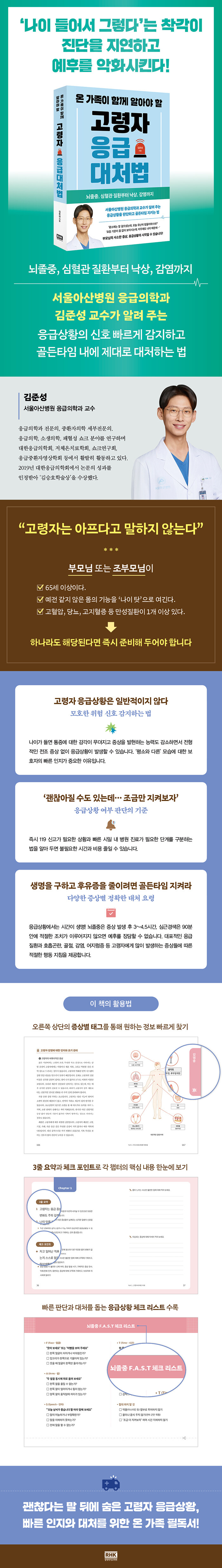 °í·ÉÀÚÀÇ ÀÀ±Þ»óȲÀº ´ëºÎºÐ »ç¼ÒÇÑ º¯È¿¡¼ ½ÃÀ۵ȴÙ. ºÎ¸ð´ÔÀÌ Æò¼Òº¸´Ù ±â¿îÀÌ ¾ø°Å³ª Àß °ÈÁö ¸øÇÏ´Â ¸ð½ÀÀ» º¸ÅëÀº ´ë¼ö·ÓÁö ¾Ê°Ô ¿©±âÁö¸¸ ¡®³ªÀ̰¡ ¸¹¾Æ¼ ±×·¸´Ù¡¯´Â ¾ÈÀÏÇÑ »ý°¢ÀÌ À§ÇèÇÑ °á°ú¸¦ ÃÊ·¡ÇÒ ¼ö ÀÖ´Ù. ¡º¿Â °¡Á·ÀÌ ÇÔ²² ¾Ë¾Æ¾ß ÇÒ °í·ÉÀÚ ÀÀ±Þ´ëó¹ý¡»Àº ¹Ù·Î ±× ÁöÁ¡¿¡¼ Ãâ¹ßÇϴ åÀÌ´Ù. ÇöÀå¿¡¼ ÀÀ±Þ»óȲÀ» ¿À·§µ¿¾È ÁöÄѺÁ ¿Â ÀÀ±ÞÀÇÇаú ±èÁؼº ±³¼ö´Â Á¶±Ý¸¸ ½Å°æ ½è´Ù¸é ÃæºÐÈ÷ ÇÇÇÒ ¼ö ÀÖ´Â ¹®Á¦·Î ÀÀ±Þ½Ç¿¡ ¿À´Â ȯÀÚµéÀ» º¸¸ç ÀÌ Ã¥À» ¾²±â·Î °á½ÉÇß´Ù. ±×°¡ °Á¶ÇÏ´Â °ÍÀº ¡°°í·ÉÀÚÀÇ ÀÀ±Þ»óȲÀº ÀϹÝÀûÀÌÁö ¾Ê´Ù¡±´Â »ç½Ç°ú ¡°ÀûÀýÇÑ ´ëó¸¸À¸·Îµµ ¿¹Èİ¡ ¿ÏÀüÈ÷ ´Þ¶óÁø´Ù¡±´Â Á¡ÀÌ´Ù. ¿¹ÄÁ´ë ÀþÀº »ç¶÷ÀÇ °æ¿ì ½ÉÀå¿¡ ¹®Á¦°¡ »ý±â¸é °¡½¿ ÅëÁõÀ» È£¼ÒÇÏ´Â °ÍÀÌ ¡®ÀüÇüÀû¡¯ÀÎ Áõ»óÀÌÁö¸¸ ³ªÀ̰¡ µé¼ö·Ï ÀÌ·¯ÇÑ ÁúȯÀÇ Â¡ÈÄ´Â ¡®ºñÀüÇüÀû¡¯ÀÌ°í ¾Ö¸ÅÇØÁø´Ù. ÀϹÝÀûÀÎ ³ëÈ Áõ»ó°ú ±¸ºÐÇϱ⠾î·Á¿î ÀÌ ¡®¸ðÈ£ÇÑ ÀÌ»ó ½ÅÈ£¡¯¸¦ Á¦¶§ ÀÎÁöÇØ¾ß¸¸ ½É±Ù°æ»öÀÇ °ñµçŸÀÓ 90ºÐ ¾È¿¡ ÀûÀýÇÑ Ä¡·á¸¦ ¹Þ°í ÈÄÀ¯Áõ ¾øÀÌ È¸º¹ÇÒ ¼ö ÀÖ´Â °ÍÀÌ´Ù. µû¶ó¼ °í·ÉÀÚ ¸öÀÌ º¸³»´Â ¹Ì¼¼ÇÑ ÀüÁ¶ Áõ»óÀ» ºü¸£°Ô °¨ÁöÇÏ´Â °ÍÀÌ ¹«¾ùº¸´Ù Áß¿äÇÏ´Ù.