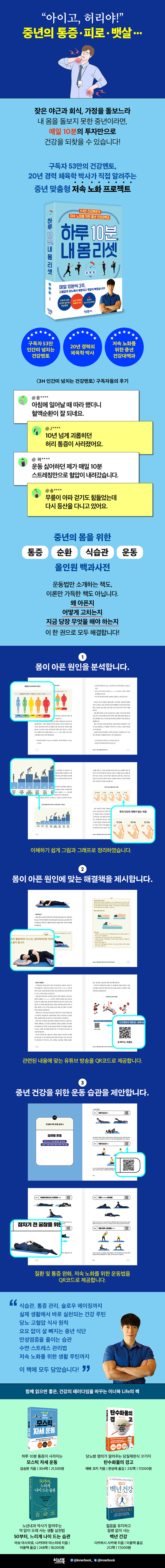 ½ÃÁß¿¡´Â °Ç° Áö½Ä¸¸ ´ã°Å³ª ƯÁ¤ ¿îµ¿¹ý¸¸ ¼Ò°³Çϴ åÀÌ ´ëºÎºÐÀÌÁö¸¸, ¡¶ÇÏ·ç 10ºÐ, ³» ¸ö ¸®¼Â¡·Àº µÎ °¡Áö¸¦ ÇÑ ±Ç¿¡ ´ãÀº ½Ç¿ë °Ç° ¹é°ú´Ù. ÀÌ Ã¥ÀÇ ÇÙ½É ÀåÁ¡Àº ¡®Áö±Ý ³» ¸öÀÌ °¡Àå ÇÊ¿ä·Î ÇÏ´Â ¿îµ¿¡¯À» ´Ü¹ø¿¡ ãÀ» ¼ö ÀÖ°Ô ±¸¼ºµÇ¾î ÀÖ´Ù´Â Á¡ÀÌ´Ù. éÅÍ 1¿¡¼´Â ¿Ö Áß³âºÎÅÍ °Ç°À» ì°Ü¾ß ÇÏ´ÂÁö ¼³¸íÇϰí, éÅÍ 2¿¡¼´Â Ç÷¾×¼øÈ¯°ú ÅëÁõº° ¿øÀÎ ¹× ÇØ°á ¿îµ¿À» Á¦½ÃÇÑ´Ù. éÅÍ 3Àº ½Ä½À°ü¡¤´ç´¢¡¤´ë»ç °Ç°¿¡ °üÇÑ ½ÇÁúÀûÀÎ °¡À̵带, éÅÍ 4´Â Àú¼Ó ³ëȸ¦ À§ÇÑ ´ÙÀÌ¾îÆ®¿Í ¿îµ¿¹ý±îÁö Á߳⿡°Ô ²À ÇÊ¿äÇÑ Á¤º¸¸¸ ´ã¾Ò´Ù.