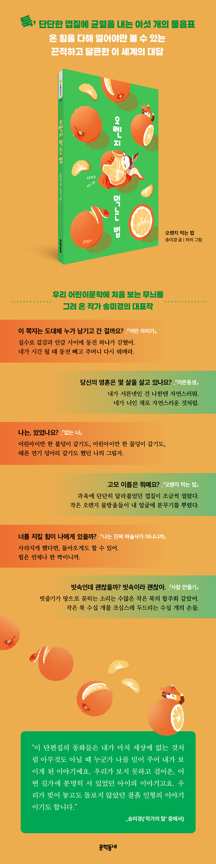 2008³â µî´Ü ÀÌÈÄ·Î Áö±Ý±îÁö, ÀÛ°¡ ¼Û¹Ì°æÀº ÇÑ°è ¾øÀÌ ³Ð¾îÁö°í ¶Ç ³ô¾ÆÁö¸é¼ ¿ì¸® ¾î¸°À̹®ÇÐÀ» ÀÐ°í ¸»ÇÏ´Â ¸ðµç À̵鿡°Ô ¾î¶² ´ë¸í»ç°¡ µÇ°í ¸»¾Ò´Ù. ¼Û¹Ì°æÀ̶ó´Â À̸§Àº ¿À·¡µÈ µµ±¸·Î´Â µµÀúÈ÷ ÃøÁ¤ÇÒ ¼ö ¾ø´Â ºñÁ¤ÇüÀÇ ¿¡³ÊÁö, ¾îµð¿¡¼µµ º» Àû ¾ø´Â ij¸¯ÅÍ¿Í ¼»ç¸¦ ÅëÇØ Àü´ÞµÇ´Â ȯ»ó¼º, Èä³»³¾ ¼ö ¾ø´Â °³¼ºÀûÀÎ ¹®Ã¼ÀÇ »ó¡À̶ó ÇÒ ¼ö ÀÖ´Ù. ½ÅÀÛ ¡º¿À·»Áö ¸Ô´Â ¹ý¡»Àº ±× »õ·Î¿ò°ú °¡´É¼ºÀ¸·Î ÆÄ¹®À» ÀÏÀ¸Ä×´ø Ãʱ⠴ëÇ¥ÀÛ ¼¼ Æí°ú ÃÖ½ÅÀÇ ÀÛǰ ¼¼ ÆíÀ» ³ª¶õÈ÷ ½ÇÀº ´ÜÆíÁýÀÌ´Ù. 20³â °¡±î¿î ½Ã°£À» µÎ°í ¾²ÀÎ ÀÌ µ¿Èµé ¼Ó¿¡ ÇѰᰰÀÌ ÈûÂ÷°Ô ¼Ò¿ëµ¹ÀÌÄ¡°í ÀÖ´Â ¾î¸° Á¸ÀçµéÀÇ ¸ñ¼Ò¸®´Â, Ä¿´Ù¶õ »ç¶ûÀ» ¹Þ°í ÀÖ´Â ´ÜÆíÁý ¡ºµ¹ ¾Ã¾î ¸Ô´Â ¾ÆÀÌ¡»¿Í ´õºÒ¾î ¿ì¸®°¡ ¾î¸°À̹®ÇÐÀ» °æÀ¯ÇØ ÇÔ²² °ø¸íÇÒ ¼ö ÀÖ´Â ¼¼°èÀÇ Å©±â¸¦ °¡´ÆÇÏ´Â »õ·Î¿î ±âÁØÀÌ µÉ °ÍÀÌ´Ù.