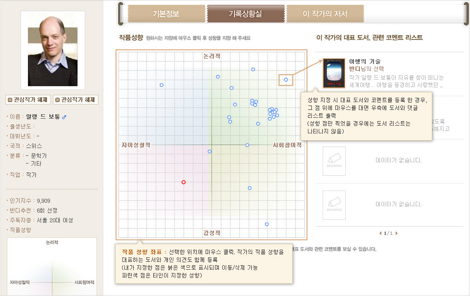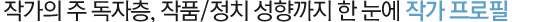 ±¹³»¡¤¿Ü ÁÖ¿ä ÀÛ°¡µéÀÇ ÇÁ·ÎÇÊÀ» DBÈ ÇÏ¿© ±âº» ¾ç·Â ¹× Àú¼ Á¤º¸¸¦ ½±°Ô Á¶È¸ÇÏ½Ç ¼ö ÀÖ½À´Ï´Ù. ¶ÇÇÑ, ¿©·¯ºÐÀÌ Á÷Á¢ ÇØ´ç ÀÛ°¡ÀÇ ÀÛǰ ¼ºÇâ, Á¤Ä¡ ¼ºÇâÀ» ÁöÁ¤ÇÏ°í ±×¿¡ ´ëÇÑ ÀǰßÀ» ÇÇ·ÂÇÏ½Ç ¼ö ÀÖ½À´Ï´Ù. ÁÂÇ¥¿Í ½Ã¼Ò ¸ð¾çÀÇ Á÷°üÀûÀΠȸéÀ» ÅëÇØ ³»°¡ ¾Ë°í ÀÖ´Â ÀÛ°¡ÀÇ ¼ºÇâÀ» Á÷Á¢ ÁöÁ¤ ÇØ º¸¼¼¿ä. ±× µ¿¾ÈÀÇ ±¸¸Å ±â·ÏÀ» ¹ÙÅÁÀ¸·Î ÇÑ ÀÛ°¡ÀÇ º£½ºÆ®/Àαâ Áö¼ö ¹× ¼±È£ µ¶ÀÚÃþ¿¡ ´ëÇÑ Åë°èµµ Á¦°øµË´Ï´Ù.